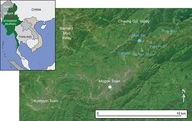 - 2000年,在缅甸克钦邦的纳米亚地区,首次发现了这种独特的霓虹红色尖晶石。此地的尖晶石大多呈鹅卵石状,源自次生矿床。