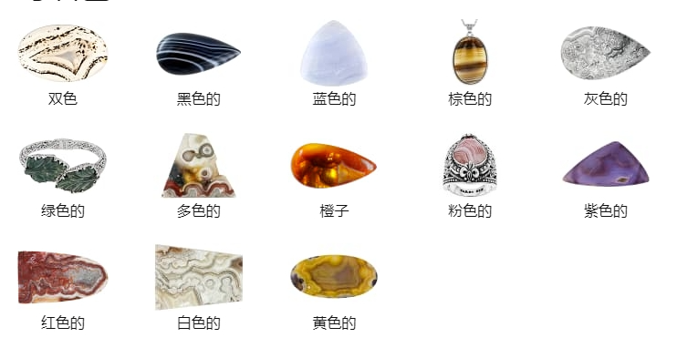 玛瑙有各种各样的颜色和独特的图案,其颜色可以从白色、黑色、红色、紫色、蓝色、绿色等多种色调不等。以下是几种常见的玛瑙颜色与品种: