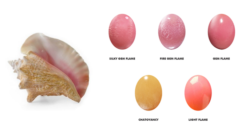 海螺珍珠具有独特的瓷器光泽和火焰结构,通常呈现白色、粉色、橙色或棕色,其中粉色或橙红色最为受欢迎。这种颜色主要源自珍珠层中的有机化合物,尤其由霰石、方解石和水组成。海螺珍珠可以长到20毫米,但10克拉以上的珍珠极为稀有,最大的海螺珍珠已达到45克拉。