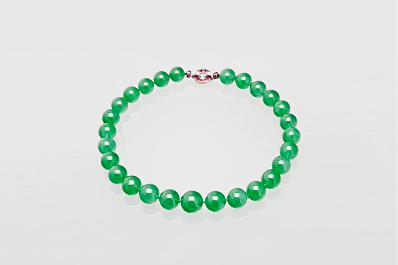 这条精美的翡翠项链配有卡地亚设计的装饰艺术扣环,于 2014 年 4 月在香港苏富比拍卖行以 2,740 万美元的惊人价格售出,创下了世界纪录。照片:SSEF。