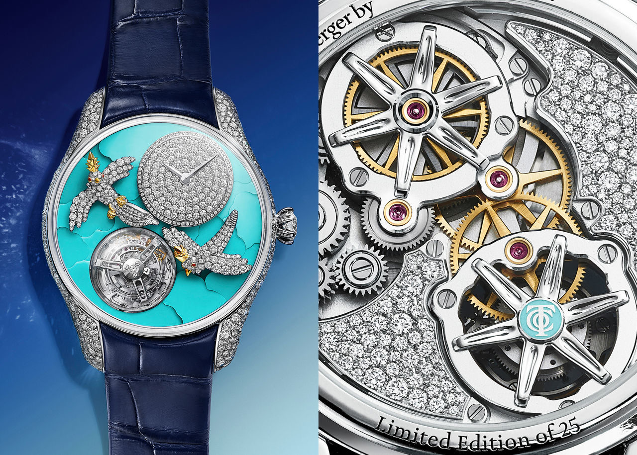 发布会的焦点是两套瞩目的高级珠宝套系。其一是礼赞坦桑石,蒂芙尼于1968年将这种瑰丽宝石引入世界。套系中包含精致的项链、手链与耳环。另一套系则彰显了绿松石的魅力,这种深植于品牌传承、亦是史隆伯杰挚爱的宝石。此套系以一条极具戏剧张力的项链压轴,一只钻石镶嵌的飞鸟栖息于一枚凸圆形切割绿松石之上。此外,吊坠、胸针与戒指等补充作品进一步延展了套系的丰富性。
