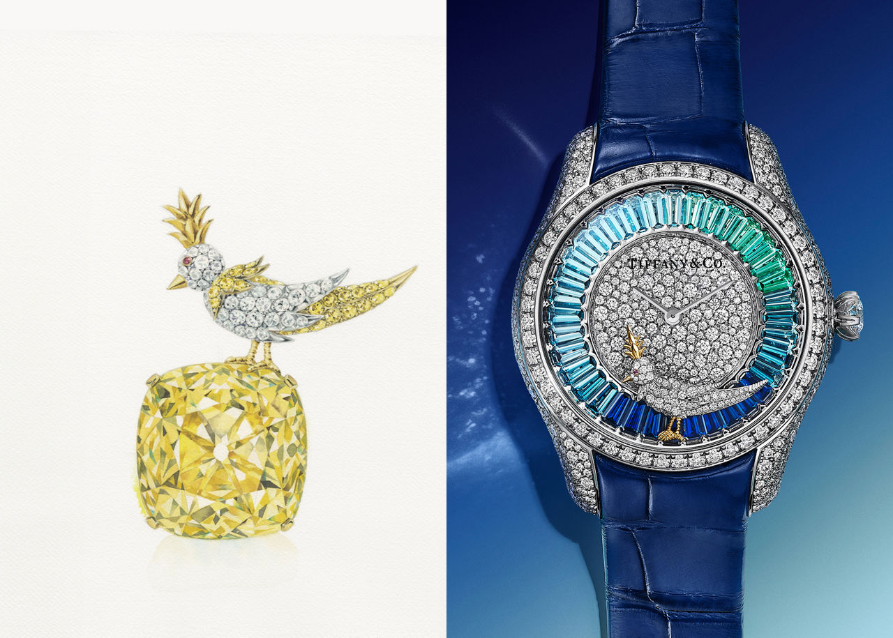 - 2023年 近年来的持续创新 Tiffany 推出了包括彩虹“石上鸟” (使用多种彩色宝石)、珍珠“石上鸟” (采用天然野生珍珠)以及围绕传奇黄钻的新设计在内的多款作品,持续焕新经典。