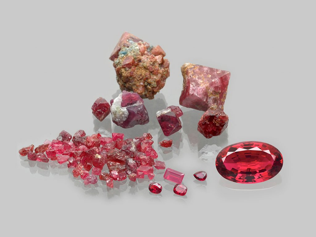 图1: 重达104克拉的马亨盖尖晶石(坦桑尼亚)及同产地的尖晶石晶体和成品。该产地以产出艳丽粉红至红色的高品质尖晶石闻名。
