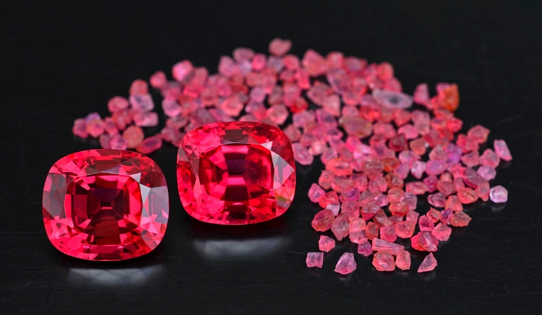 马亨盖产出的尖晶石以鲜艳的粉红至红色最为著名,色调涵盖桃红、霓虹粉红、亮红和橘红等,被形象地称为“霓虹贵族”或“泡泡糖粉”色调;这些宝石在日光下呈现强烈的荧光效果,红色火彩十足,几乎不带任何褐色或灰色调。 照片:在坦桑尼亚马亨盖发现的钴尖晶