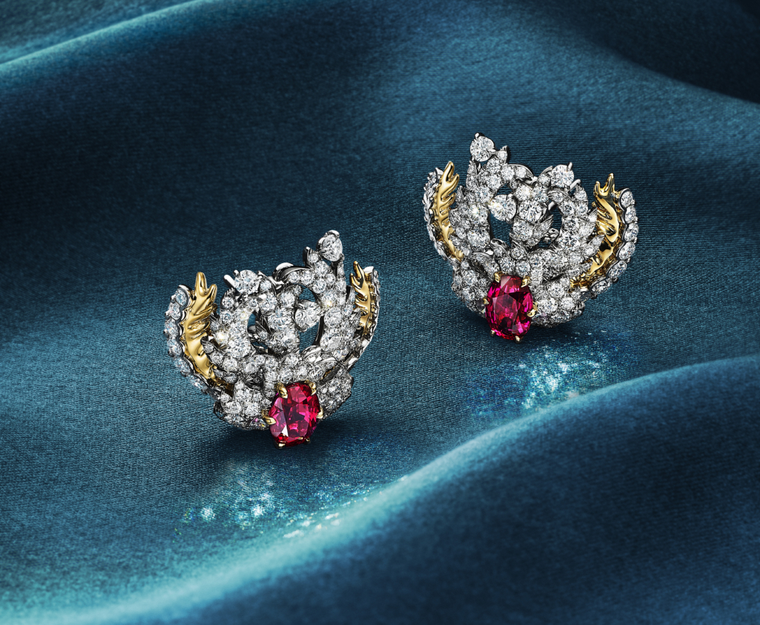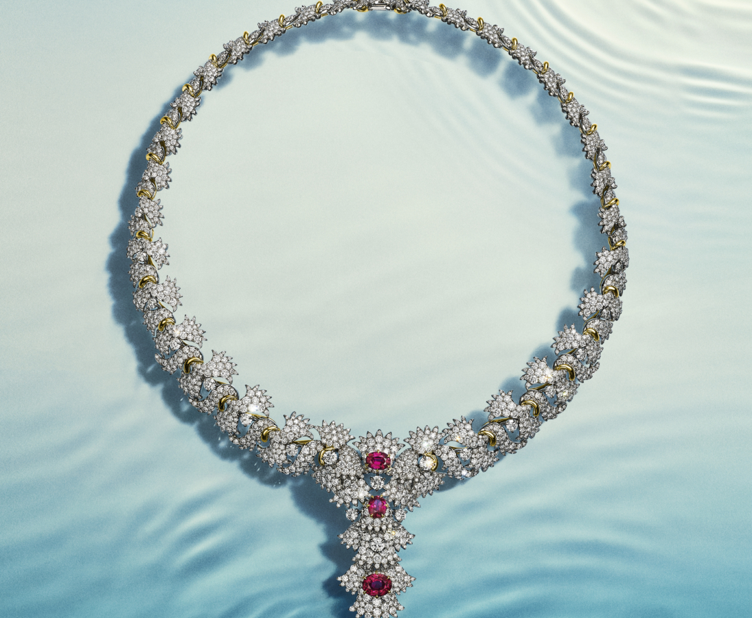 核心作品是一条惊艳项链,镶嵌三颗 未经处理的莫桑比克红宝石(总重约 5 克拉),色泽浓郁,光彩灵动,仿佛随水流摇曳。