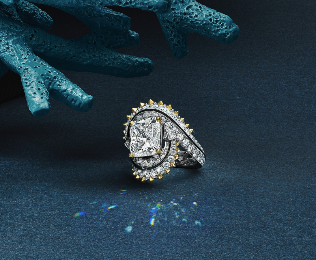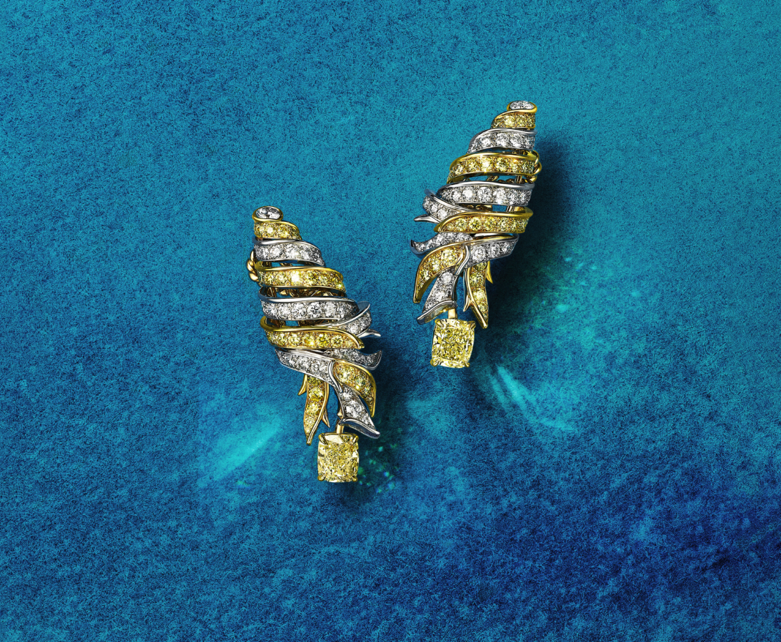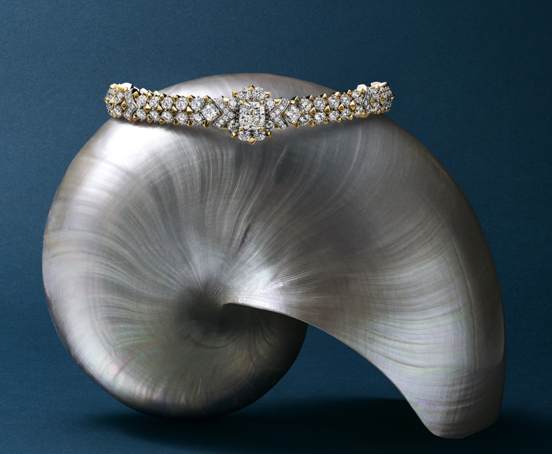 此系列探索海洋生物的自然结构与曲线,以铂金与黄金塑造层叠形态,并以白钻与黄钻交织呈现壳纹光影。