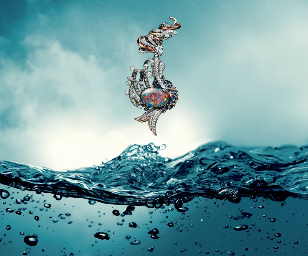 - 主打胸针以铂金、玫瑰金与钻石雕琢而成,鱼鳍上镶嵌一颗 逾 10 克拉黑蛋白石。