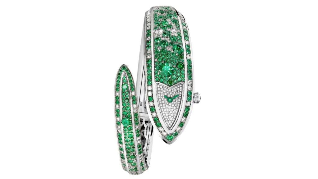 腕表共镶嵌 263 颗祖母绿与 535 颗钻石,总重近 10 克拉。祖母绿的深邃与钻石的闪耀交织,如灵蛇在腕间轻舞,象征永恒与重生。