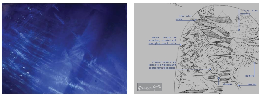 - 克什米尔:常见呈链状/具特定几何关系的准次生流体包裹体(pseudo‑secondary fluid inclusions),在斜射/纤维光下反射特征明显。