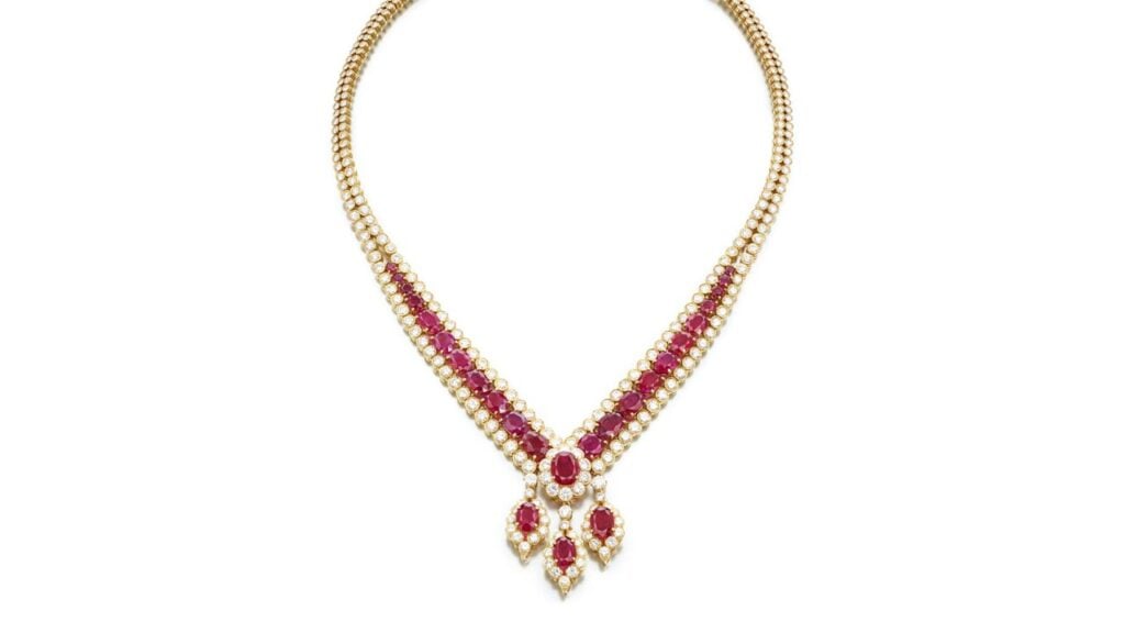 主石为一颗5.20克拉缅甸红宝石,另有三颗可拆卸吊坠,红宝石总重超10克拉。最终成交价为838,200瑞士法郎(约110万美元),远超估价。