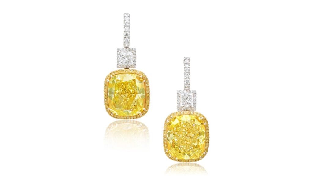 镶嵌两颗重达38.66克拉和38.88克拉的艳彩黄钻,以及两颗约2克拉的矩形钻石,最终以270万瑞士法郎(约合340万美元)成交,价格符合预期。
