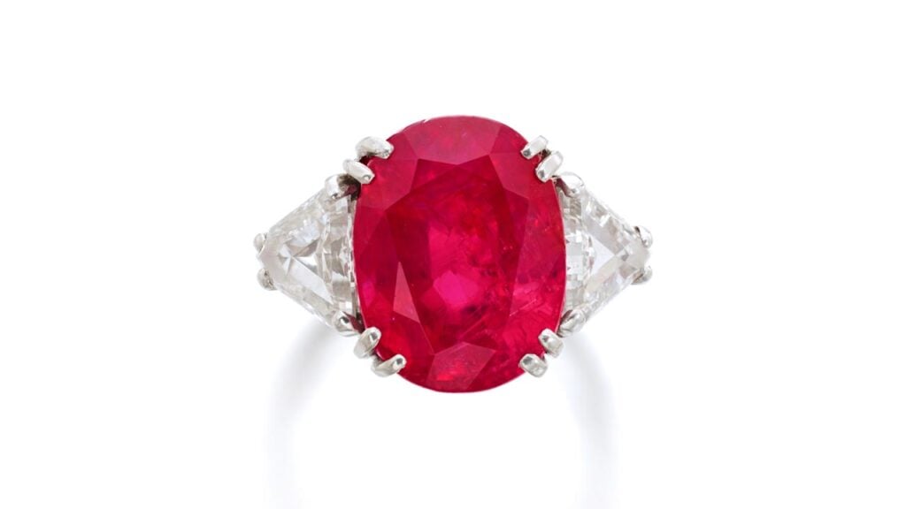 一枚镶嵌12.78克拉枕形缅甸红宝石的戒指,估价55万瑞士法郎,最终以110万瑞士法郎(约140万美元)成交,翻倍成交。