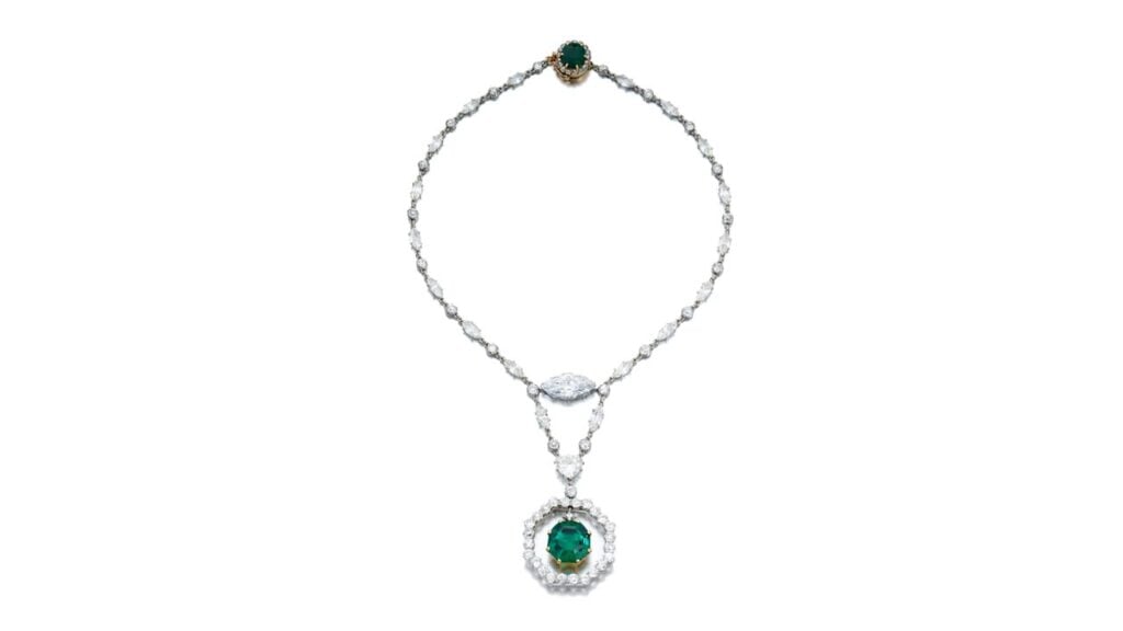 镶嵌11.78克拉哥伦比亚祖母绿和一颗5.54克拉D色马眼钻石,典雅又不失皇家气度,最终成交价130万瑞士法郎(约170万美元),拍场表现不俗。
