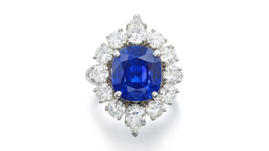 主石为7.69克拉垫形克什米尔蓝宝石,环绕梨形和明亮式切割钻石,最终成交价为约120万美元,大幅超出预估上限。