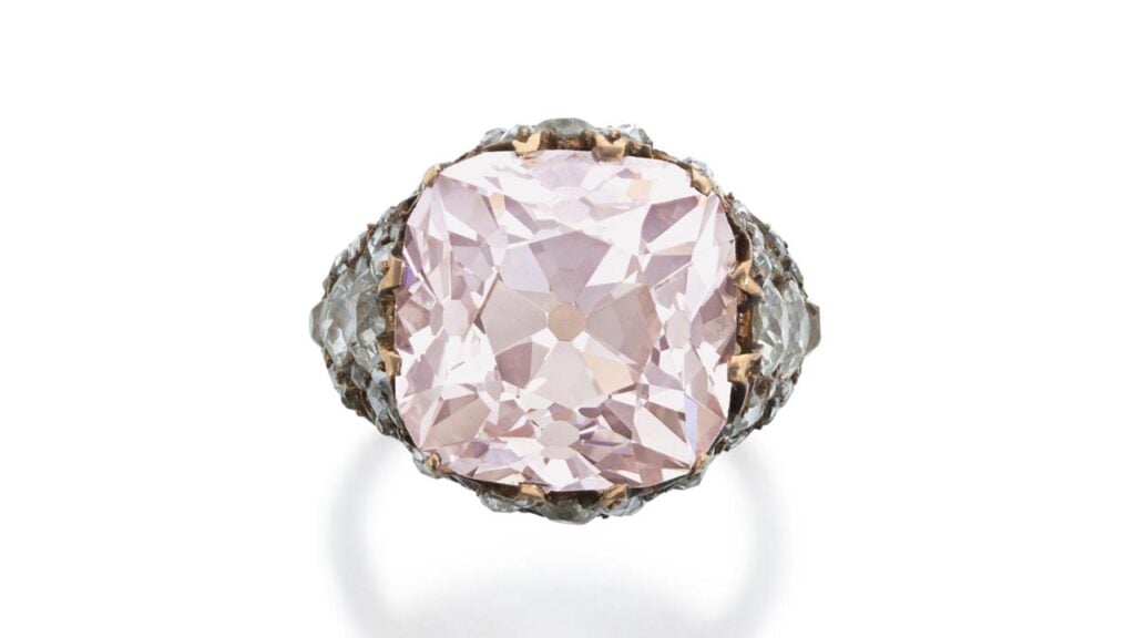 这枚由俄罗斯女皇叶卡捷琳娜一世拥有的戒指,镶嵌13.86克拉浅粉色钻石,后传至奥斯曼帝国公主手中,最终以290万瑞士法郎(约370万美元)成交,是估价的七倍。
