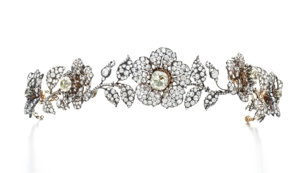 这顶诞生于1840年左右的冠冕可变换为五枚胸针与两对耳夹,以野玫瑰花环为灵感,最终以393,700瑞士法郎(约49万美元)成交,是估价的两倍多。