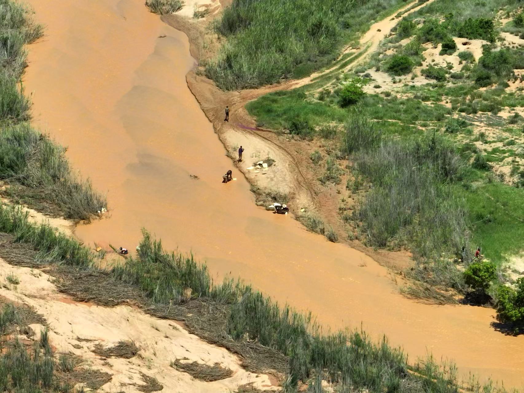 用无人机拍摄的,在伊拉卡卡河床上淘矿沙的马达人