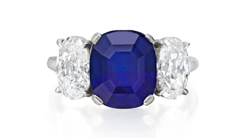 本场拍卖的领衔之作,是一枚估价高达50万美元的克什米尔蓝宝石戒指。这颗5.40克拉的枕形蓝宝石,色泽浓郁、质地通透,两侧各镶嵌一颗椭圆形钻石,工艺与美感俱佳,堪称可佩戴的艺术珍品。