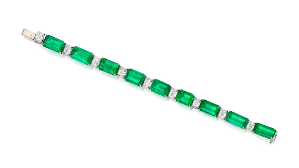 这款手链以九颗阶梯切割哥伦比亚祖母绿为主石,总重达36.69克拉,色泽浓郁,与九颗阶梯切割钻石交替排列,钻石总重9.57克拉,G至H色、VVS1至VS2净度,展现出刚柔并济的高级质感。