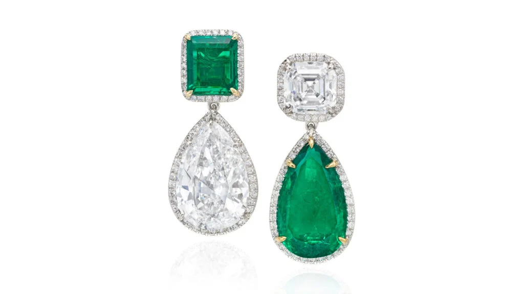 这对耳环设计独特、不对称却和谐。一只镶嵌3.01克拉D色钻石与6.44克拉梨形祖母绿,另一只则为1.93克拉祖母绿配7.45克拉E色钻石。整体镶嵌于圆形切割钻石底座之上,闪耀动人。