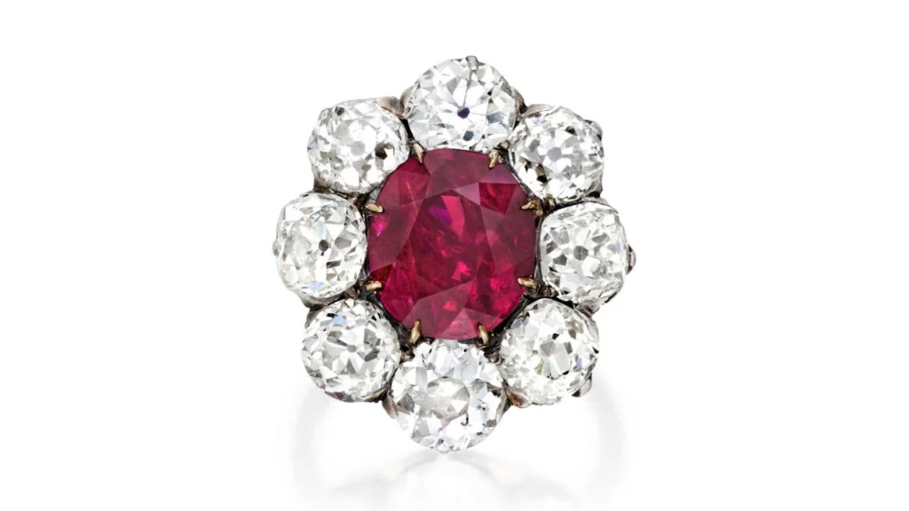 这枚戒指镶嵌一颗5.27克拉的椭圆形缅甸红宝石,红宝石周围围绕着八颗老式切割钻石,尽显古典华丽风格。缅甸红宝石一向被誉为顶级红宝石产地,其收藏价值不言而喻。