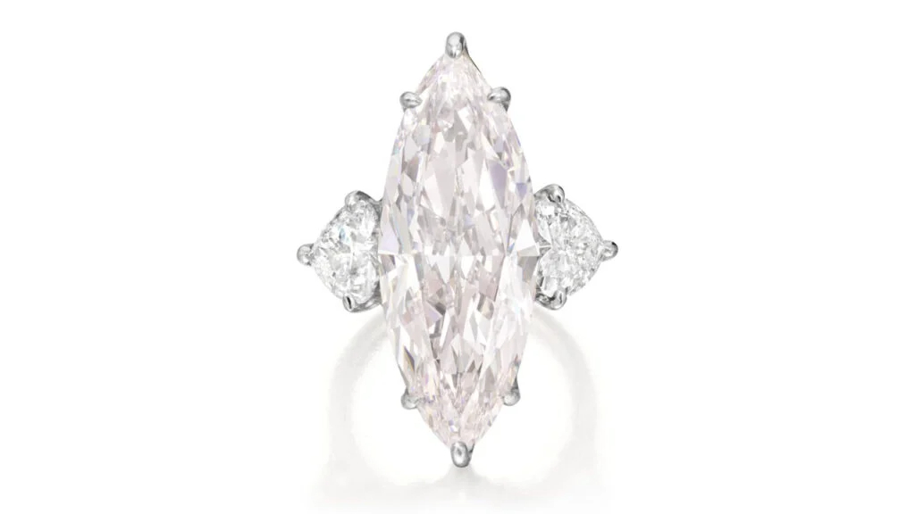 这枚戒指的主石为一颗马眼形、15.12克拉的浅粉色钻石,VVS2净度,具备潜在的“内部无瑕”评级,两侧配有心形钻石,柔美中透露出奢华与稀有。
