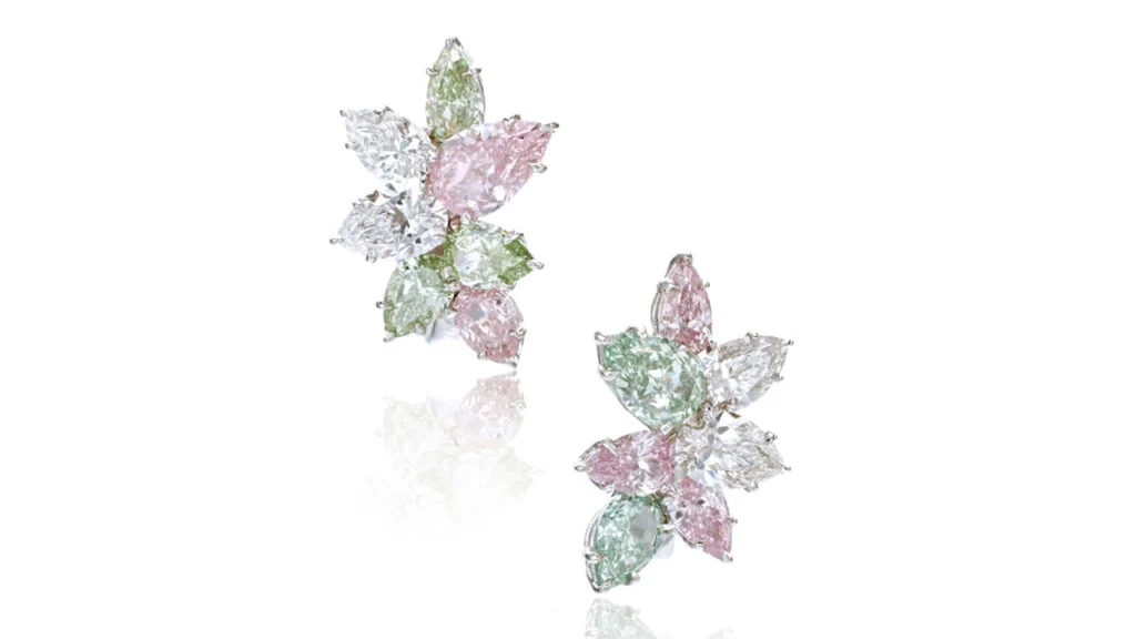 - 镶嵌:14颗梨形钻石(含D至F色、艳彩粉钻、艳彩绿钻)