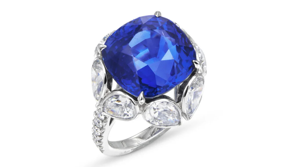 - 主石为15.28克拉枕形斯里兰卡蓝宝石,搭配梨形与圆形钻石装饰