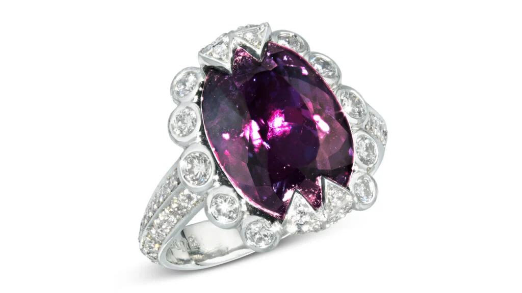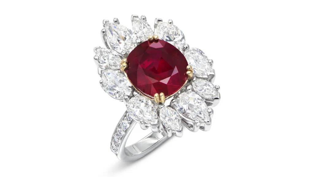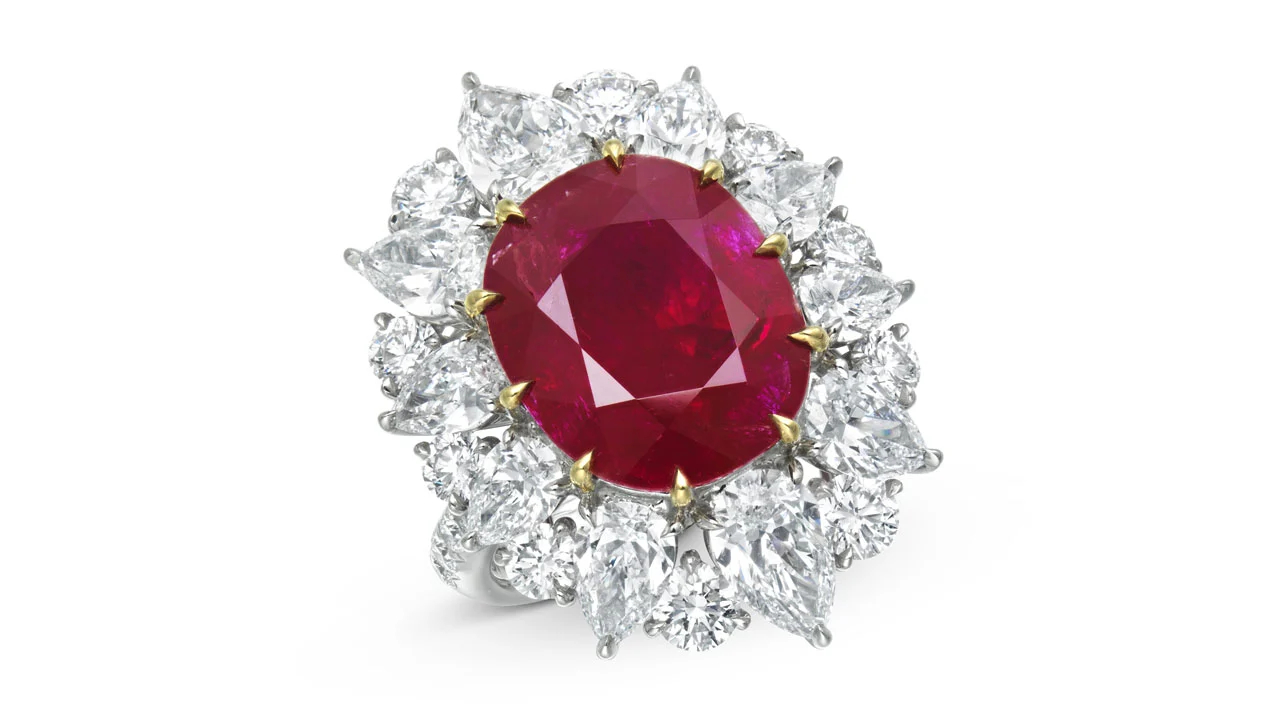 这枚戒指主石为一颗椭圆形缅甸红宝石,四周环绕梨形切割钻石,整体设计兼具经典与奢华。如此耀眼的成交,既彰显了市场对高品质缅甸红宝石的追捧,也再次验证了稀有宝石的收藏价值。