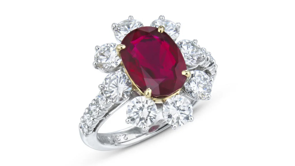 - 红宝石为明亮式切割,环绕八颗圆钻