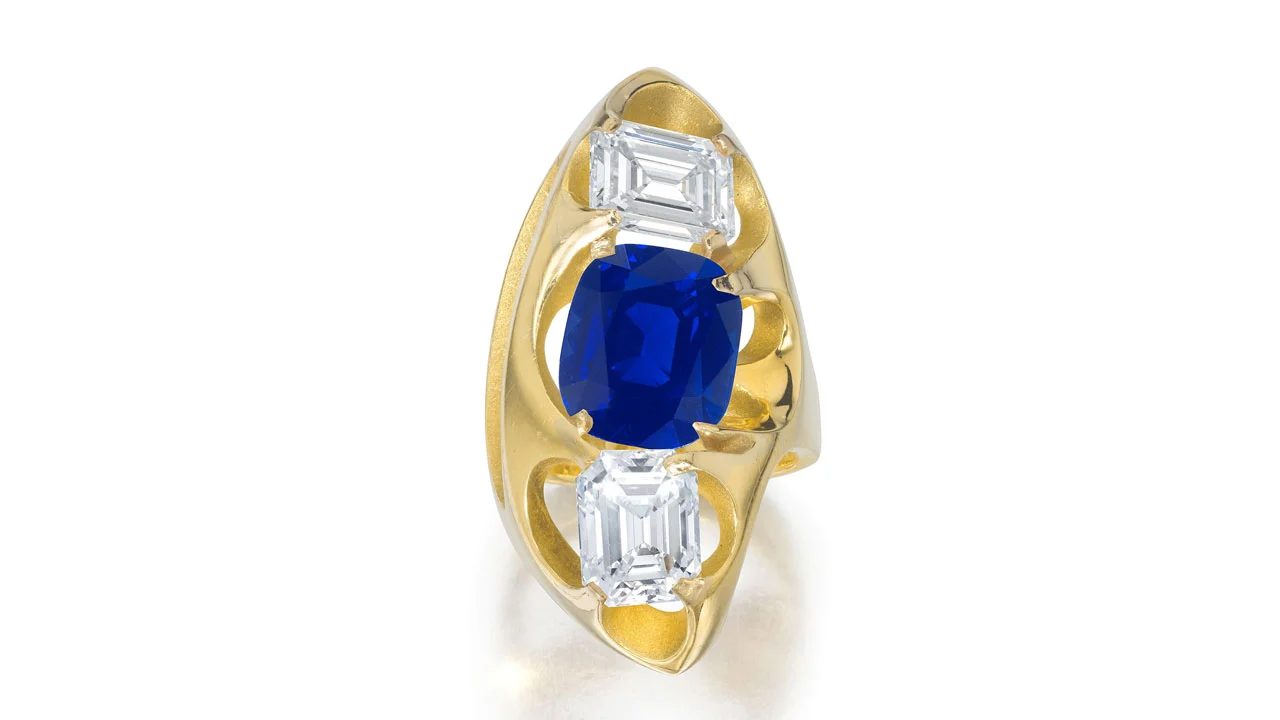 这枚引发竞价热潮的戒指,主石为一颗重达6.92克拉的枕形切割克什米尔蓝宝石,镶嵌于精美的镂空黄金底座之上。其左右两侧则分别点缀着2.34克拉和2.62克拉的祖母绿切割钻石,整体设计复古而精致,典雅大气。