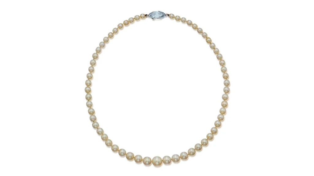 一条由59颗珍珠与艳彩蓝钻搭扣组成的项链,估价上限为120万美元,成交价达到130万美元;