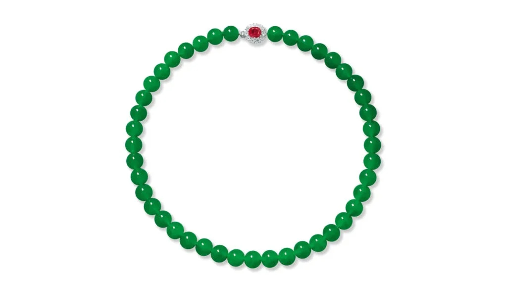 - 💎特点:43颗翡翠珠,配红宝石与圆形钻石搭扣