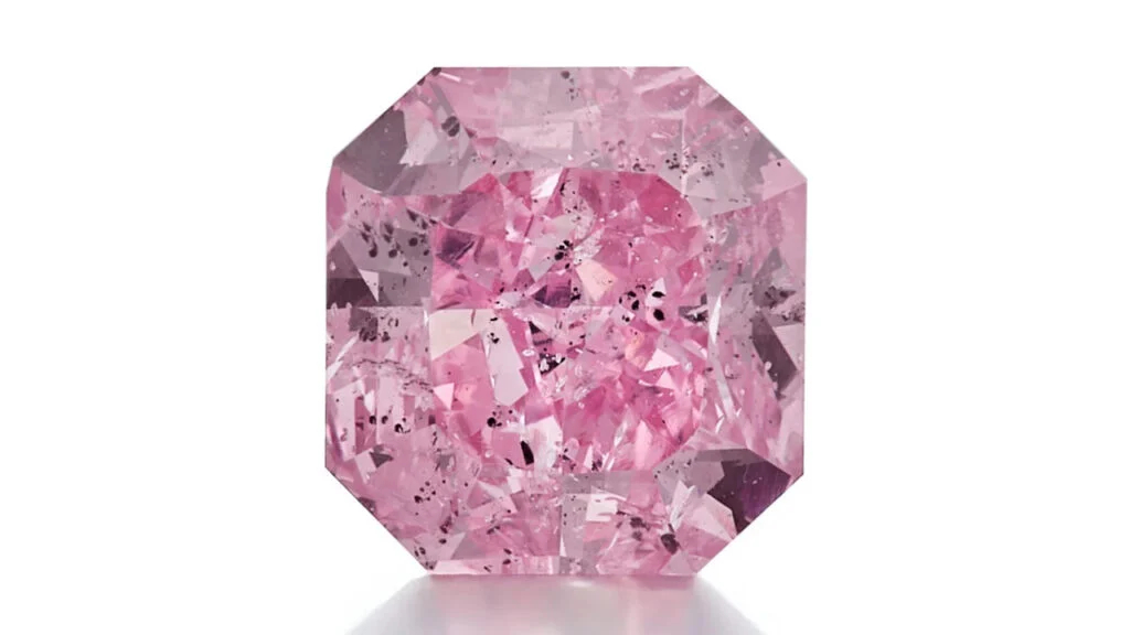 - 详情:这颗未镶嵌的切角矩形紫粉色钻石,虽颜色珍贵,但因净度为I2,在拍卖中未获竞拍成功。
