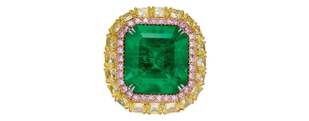 - 详情:主石为27.16克拉祖母绿,搭配黄钻、粉钻与白钻组成华丽设计,但最终流拍。