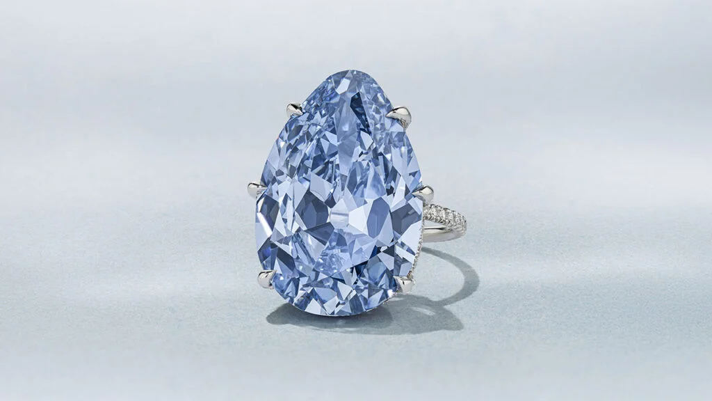 - 详情:出自传奇珠宝设计师JAR,这枚戒指镶嵌一颗重23.34克拉的艳彩蓝钻,梨形切割,品质极高。原计划亮相佳士得,却在拍前被主人撤回,并私下售予家庭成员。