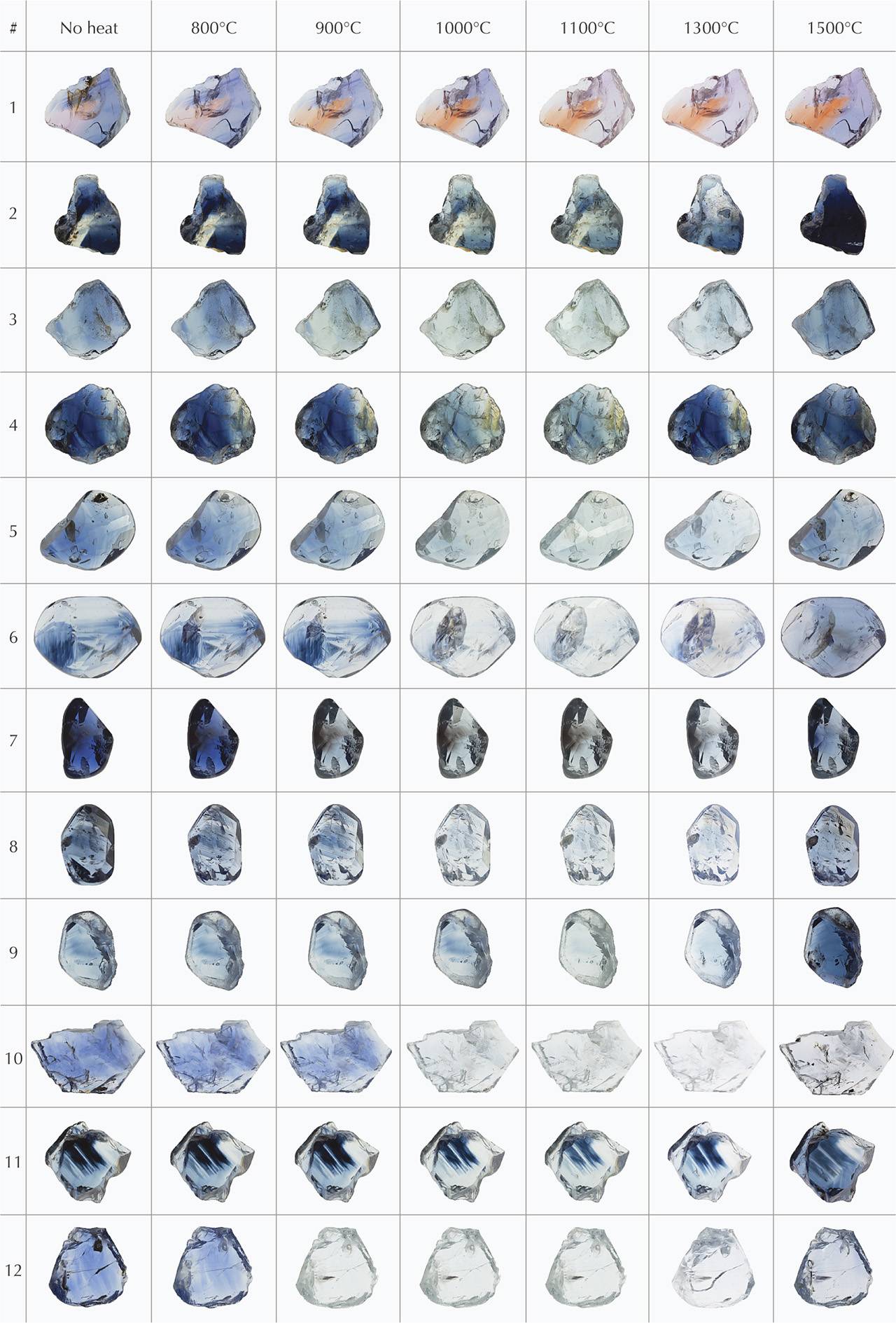 GIA的研究展示了12颗蓝宝石样品在加热至特定温度之前和之后的对比。大多数样品在加热至大约在900-1000°C 后开始变浅,宝石的颜色在 1300°C 左右再次加深。加热至 1500°C 后,许多宝石的颜色变得更加深。