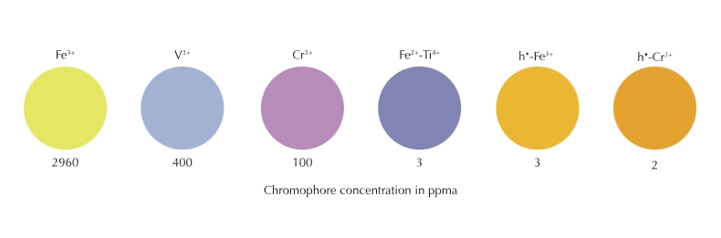比如上图,弱致色机制(如 Fe³⁺)需要接近 3000 ppma, 而强致色机制(如 Fe²⁺–Ti⁴⁺、h•–Fe³⁺、h•–Cr³⁺) 只需 2–3 ppma 就能产生同等级的颜色饱和度。