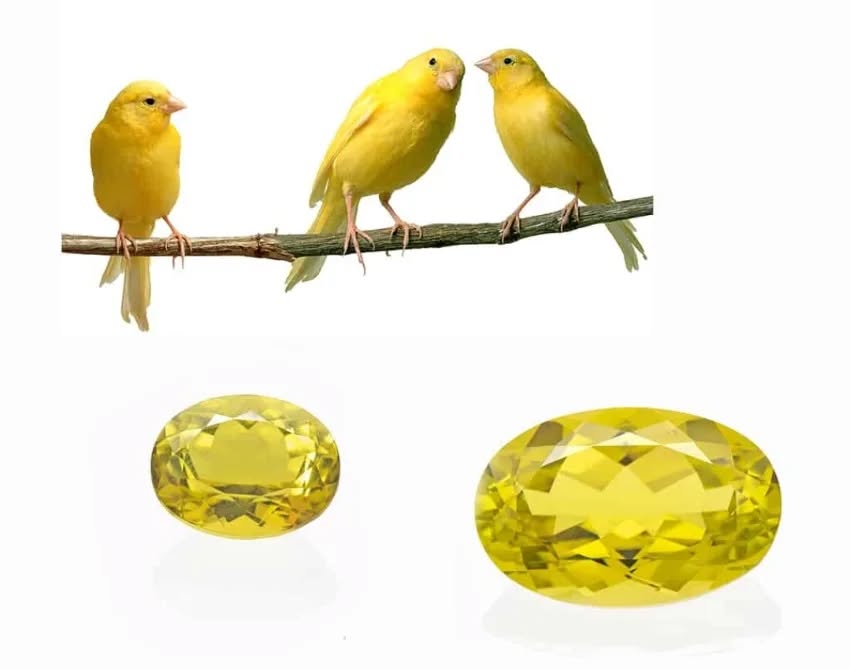 在有色宝石领域,色调鲜艳的黄色碧玺也被称为“金丝雀碧玺”。瑞士SSEF研究博客报道,锰铝榴石类(黄托帕石)明亮黄色碧玺被称为“Canary tourmaline(金丝雀碧玺)”,最早于1982年在赞比亚卢达齐地区发现。该名称来自碧玺明黄色近似金丝雀鸟羽色的形象比喻。此外,有资料称马拉维也发现过颜色纯正的黄色碧玺(2000年发现),但其文献以贸易报道为主。相比之下,“金丝雀”一词在黄色蓝宝石等其他彩宝中的使用历史不详,多见于商业营销描述,无明确早期学术记录。