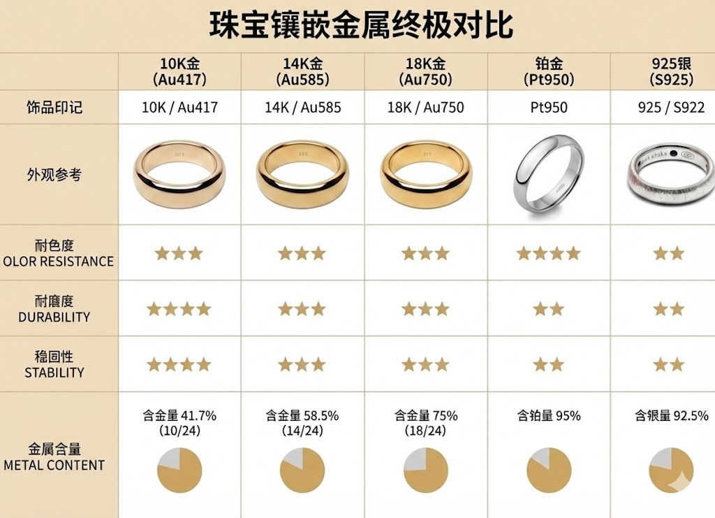 极为在意成本:则可考虑9K金或银质饰品(非高端首饰),但需理解其色泽和质感与18K金有所差距。