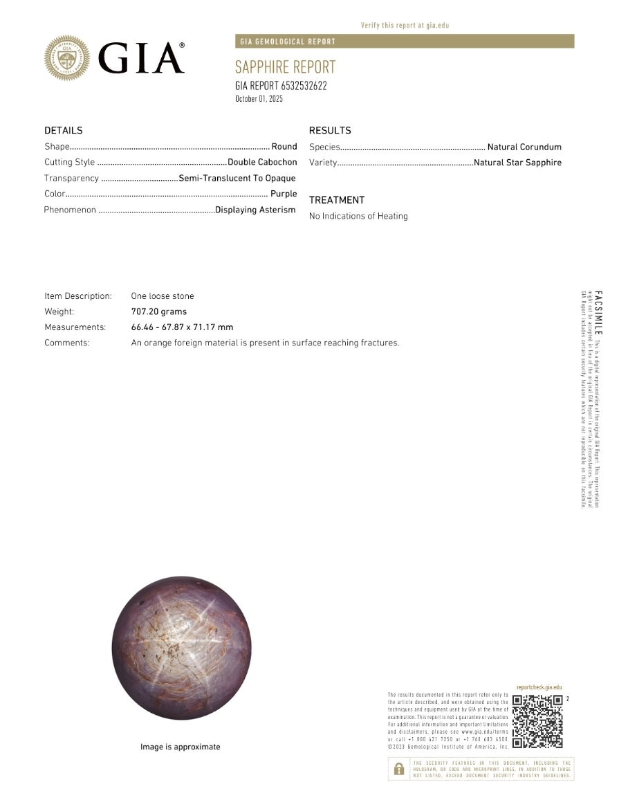 这颗蓝宝石是在宝石王国斯里兰卡(锡兰)被发现的,由美国宝石学院(GIA)认证,并由权威的兰卡宝石实验室独立鉴定,确认其天然产地身份。它是目前有记录以来全球最大的圆形切割天然紫色星光蓝宝石,其重量和特性创下了世界纪录。
