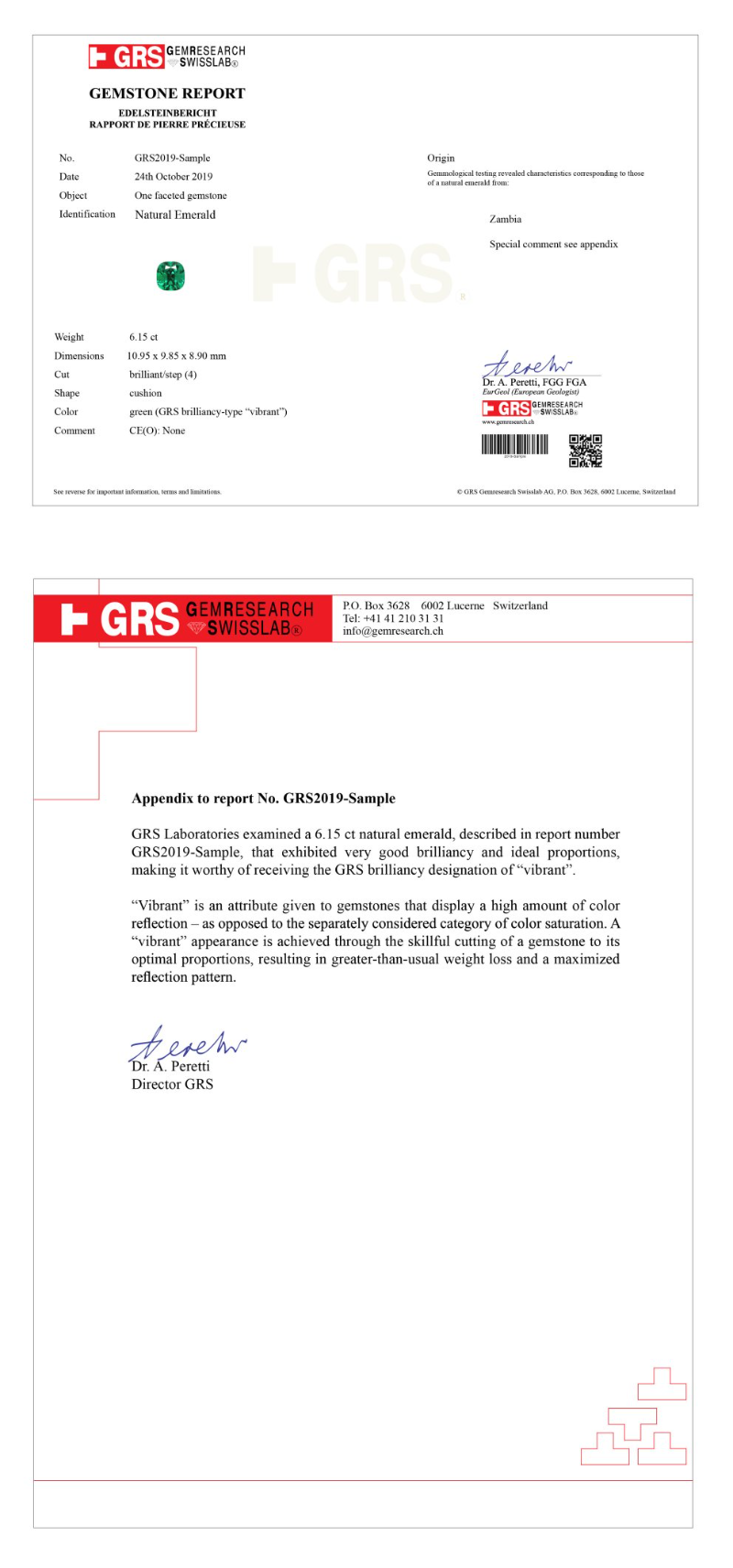 被授予 GRS 亮度类型“鲜艳”称号的宝石的报告将附有以下附录