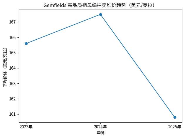 Gemfields近三年的公开拍卖数据,为观察彩色宝石上游供需变化提供了相对清晰的参照系。尤其是祖母绿与红宝石两大核心品类,在价格节奏与波动结构上呈现出明显差异。