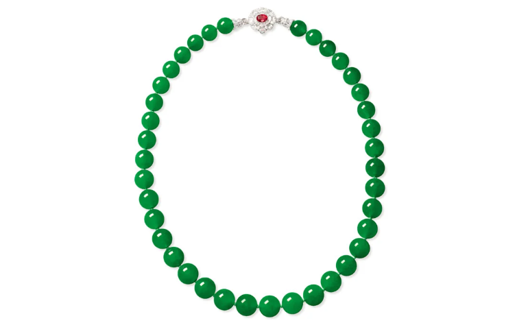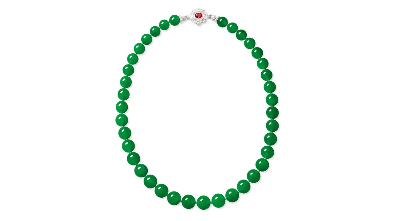 这条领衔拍品由38颗翡翠珠串联而成,整体色泽均匀,颗粒匹配度较高。项链搭扣镶嵌一颗1.51克拉椭圆形切割红宝石,并辅以多颗异形钻石点缀,在设计上延续了传统高端翡翠珠链“以珠为主、彩宝点睛”的经典结构。