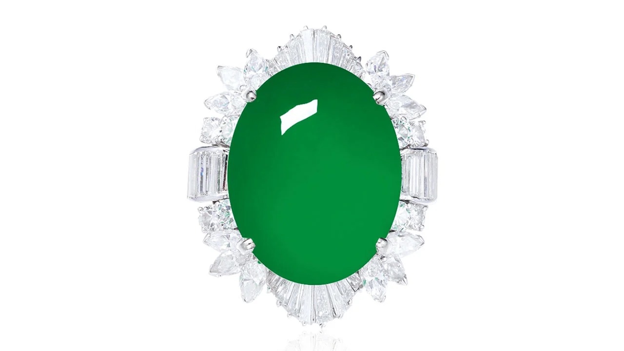 一枚翡翠蛋面戒指(配长方形、马眼形及圆形钻石围镶)以140万港元成交。