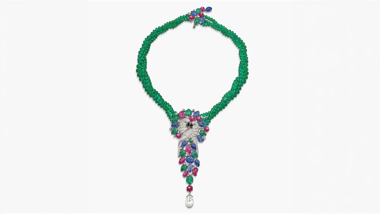 来自 卡地亚 的“Tutti Frutti”水果锦囊项链以鹦鹉造型呈现,融合祖母绿、红宝石、蓝宝石与钻石等多种材质,最终以 2160万港元 成交,远超估价上限。