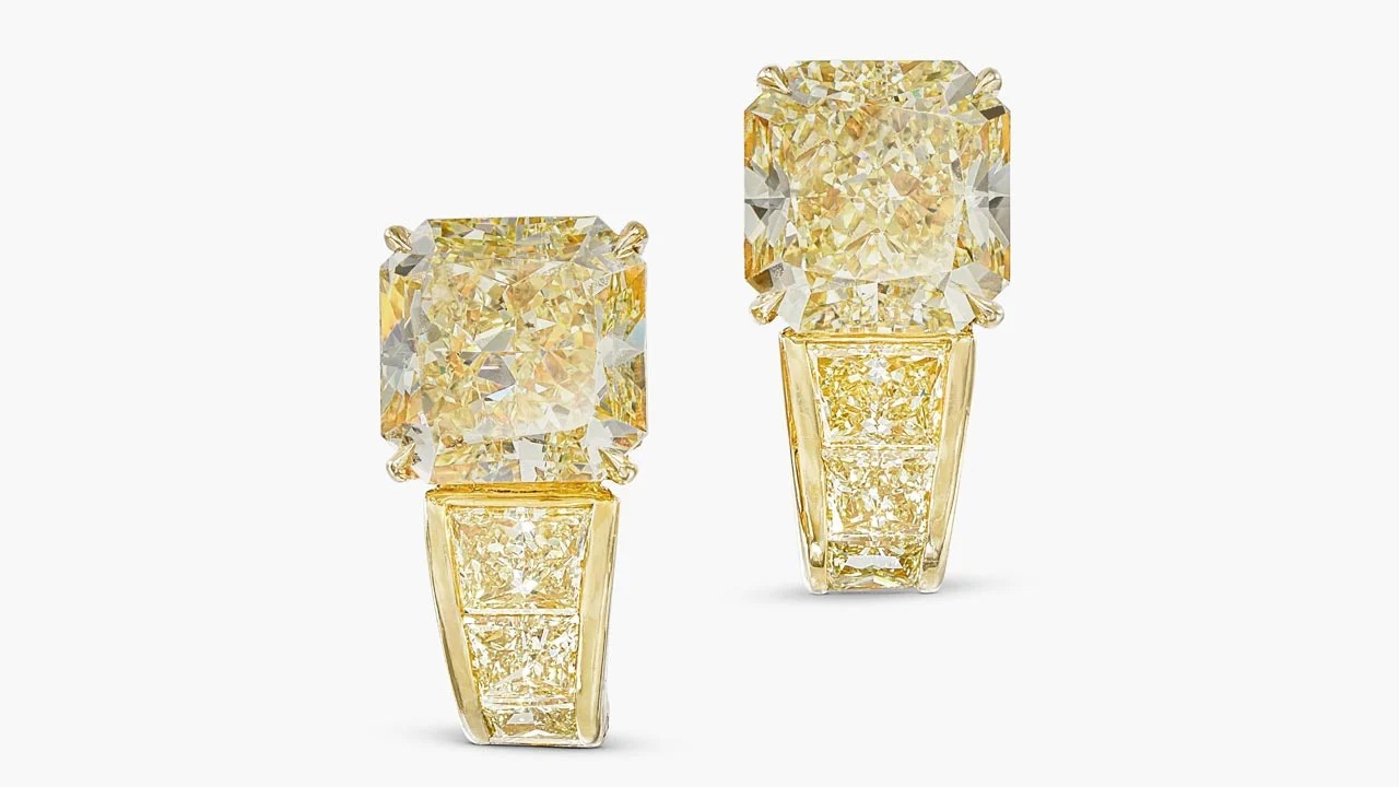 卡地亚一对艳彩黄钻耳夹也取得83.2万港元成交价。耳夹镶嵌两颗枕形艳彩黄钻,重量分别为5.01克拉和5.03克拉,净度分别为VS2及SI1,并配有约2至3克拉的黄色调钻石。该拍品原估价为30万至50万港元,最终成交价同样明显超出预期。