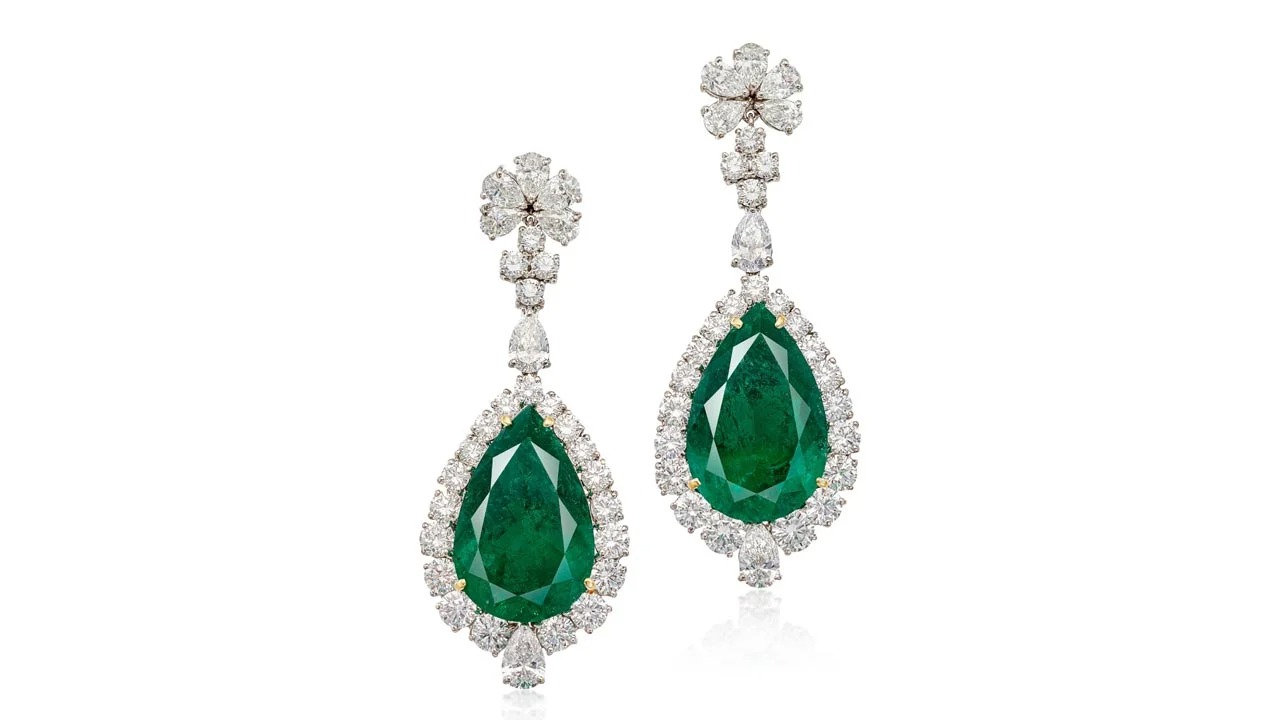 除黑钻戒指外,一对镶嵌哥伦比亚祖母绿的耳环同样以96万港元成交。该对耳环主石为两颗梨形哥伦比亚祖母绿,重量分别为11.52克拉及13.74克拉,周围配镶并悬挂总重约10克拉的梨形及明亮式切割钻石。其成交价落在80万至120万港元的估价区间内。